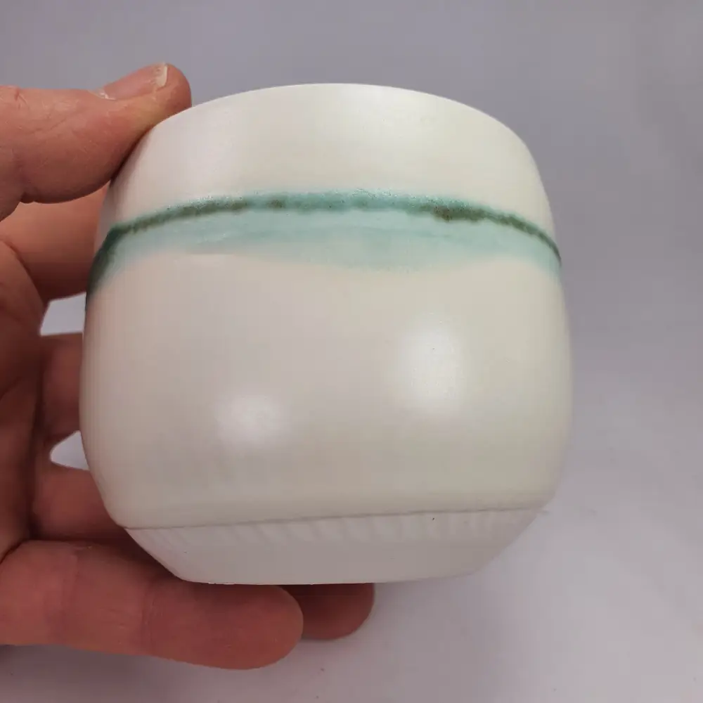 Je tourne ces bols à la main. Je texture parfois la surface des tasses avant l’émaillage.