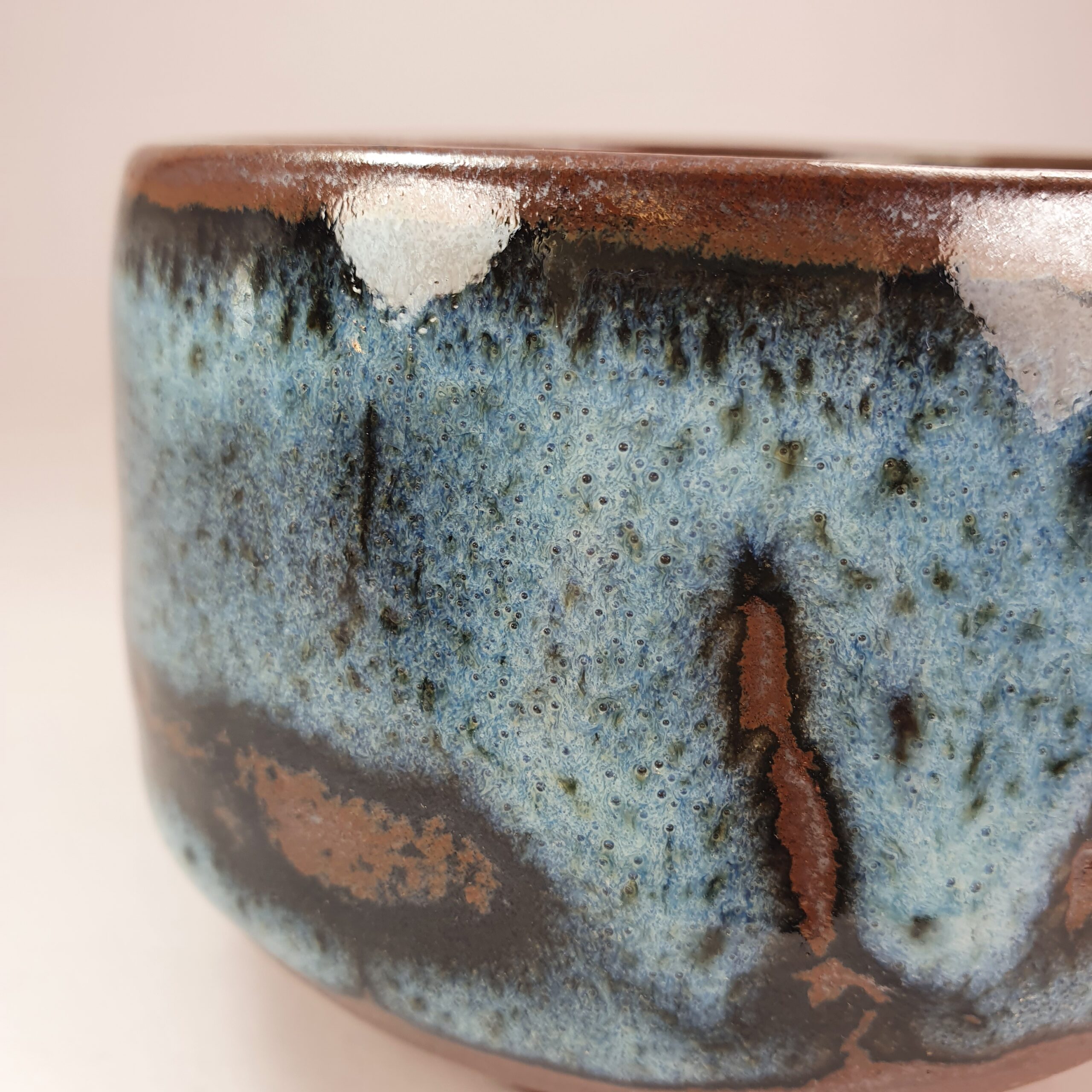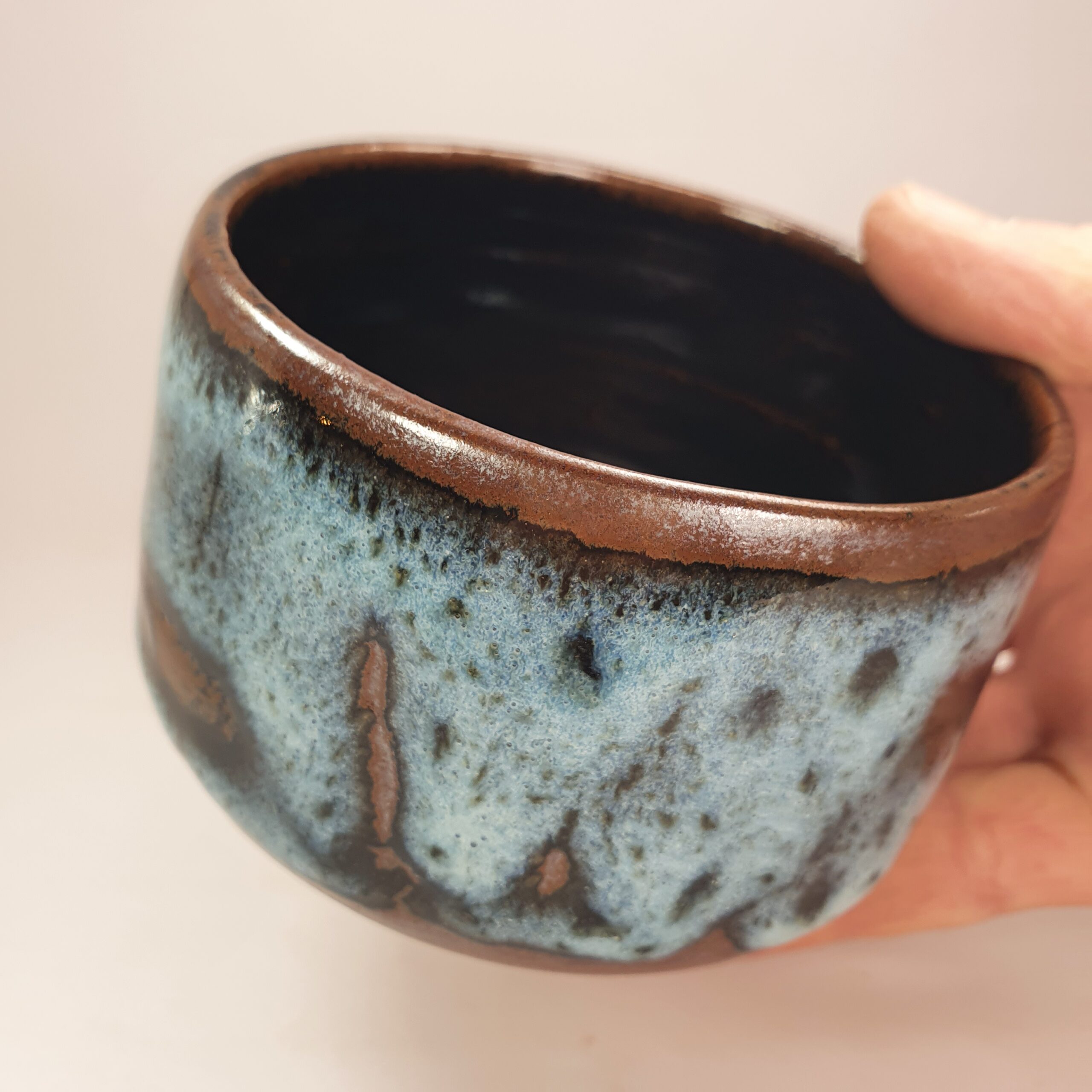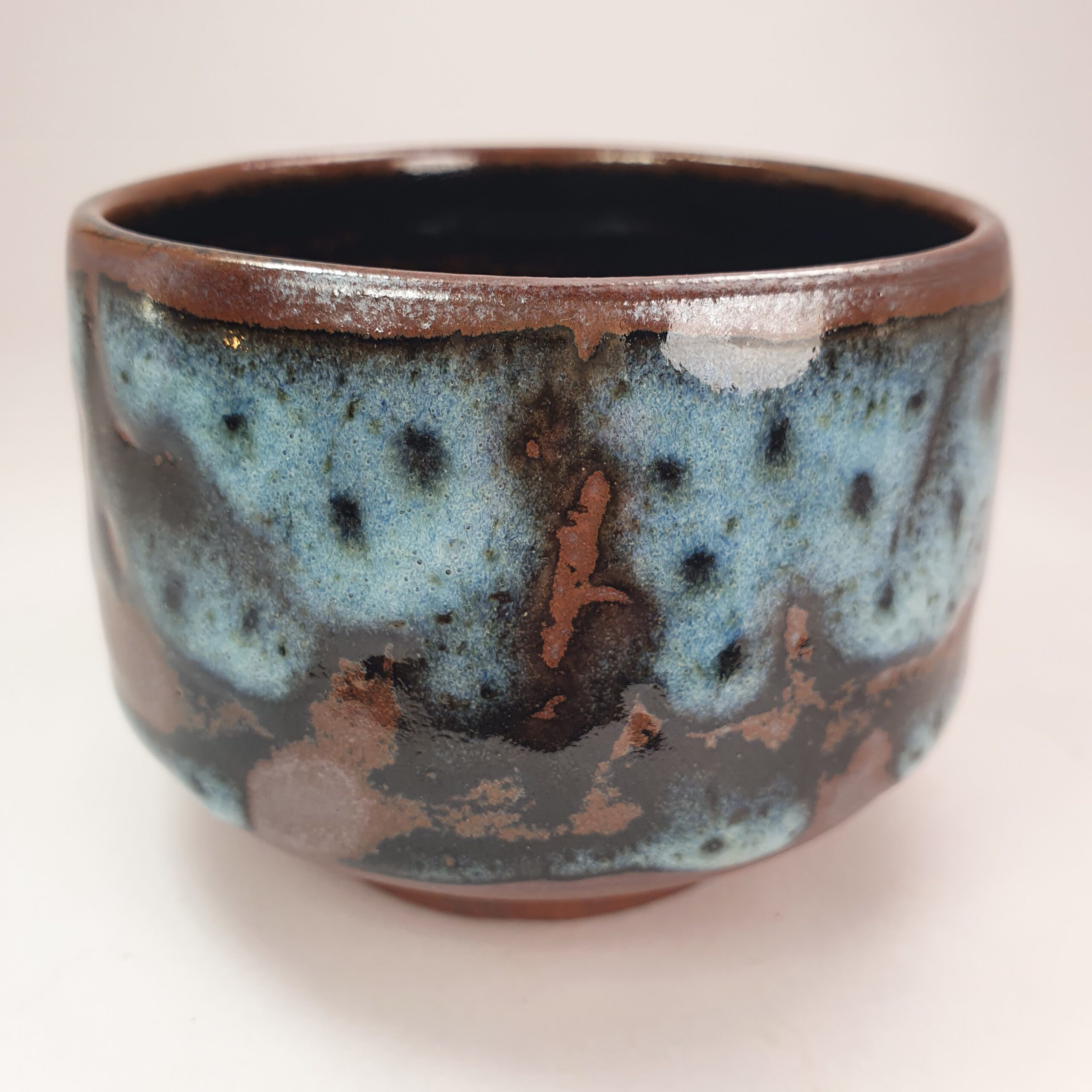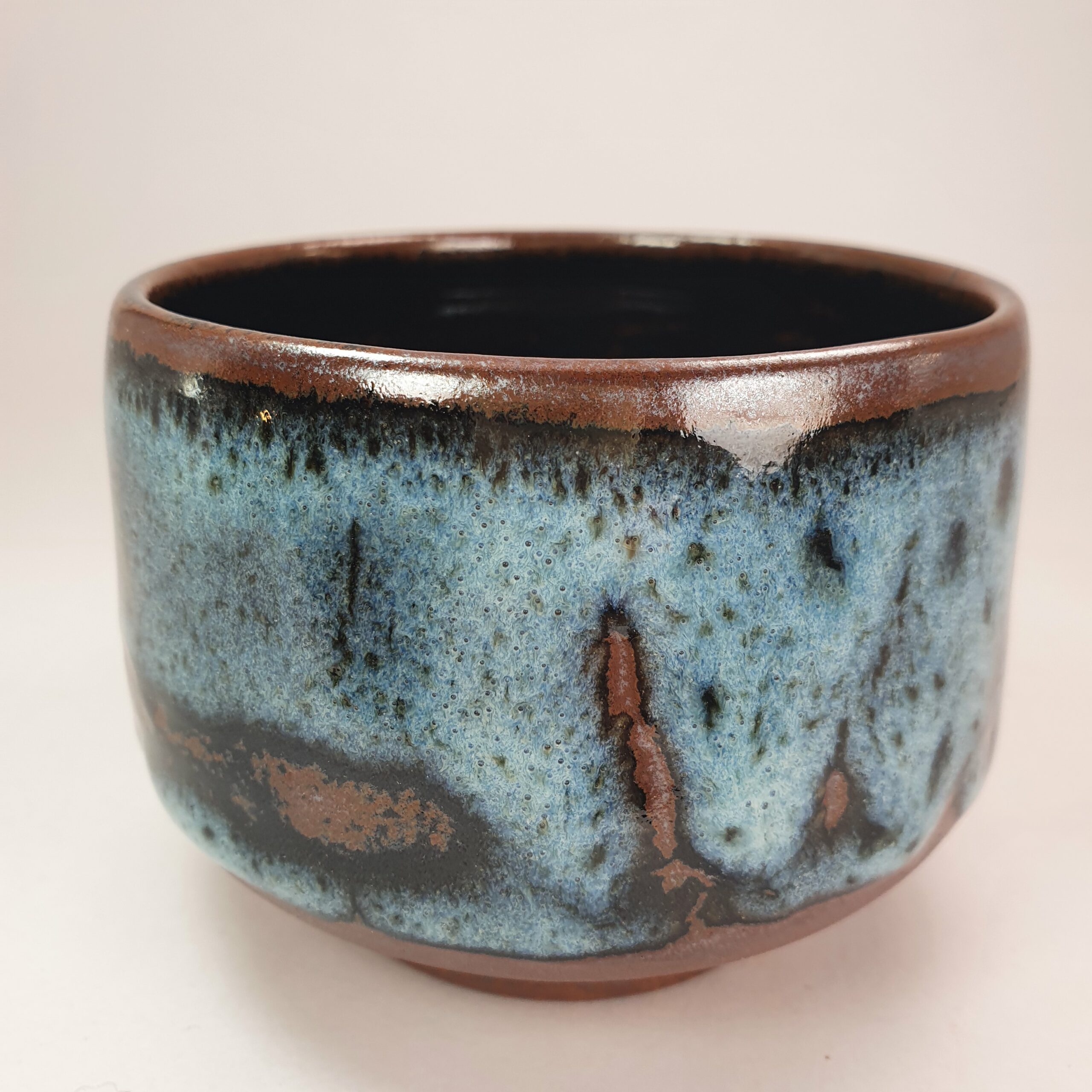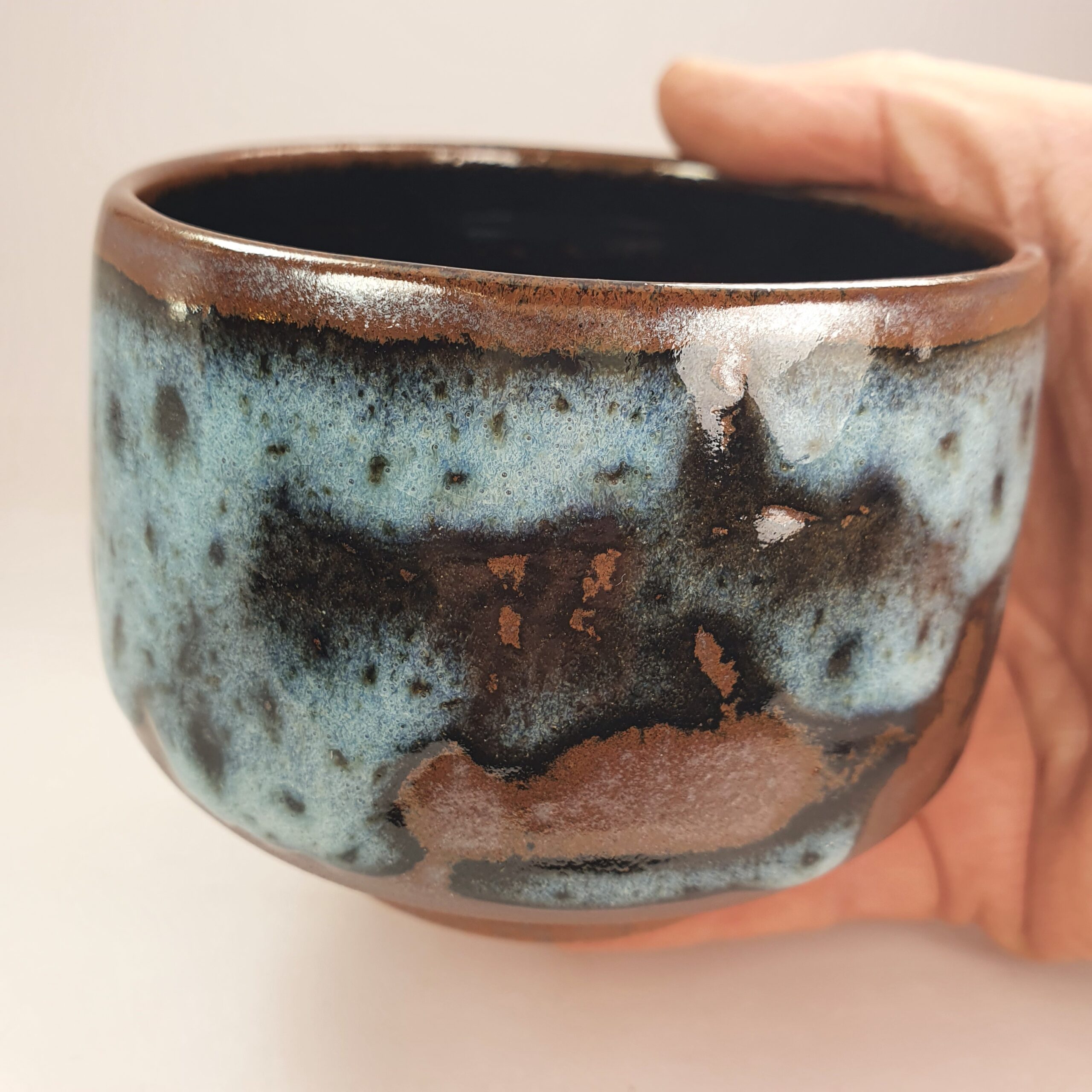 Bol chawan en grès, tourné à la main. Tons Tenmoku et Bleu de fer.