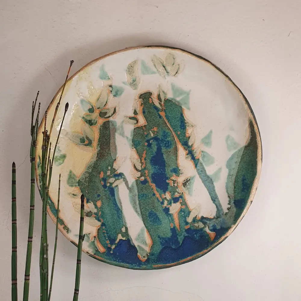 Sur ce grand plat, les glaçures sont déposées à la louche, dans un geste libre et maîtrisé, puis ponctuées de touches colorées. Un jeu de réserves et d’ajouts successifs d’émaux crée des variations subtiles de matière, de profondeur et de relief. À la cuisson, les émaux se mêlent, se fondent ou se contrastent, captant la lumière différemment selon les zones.