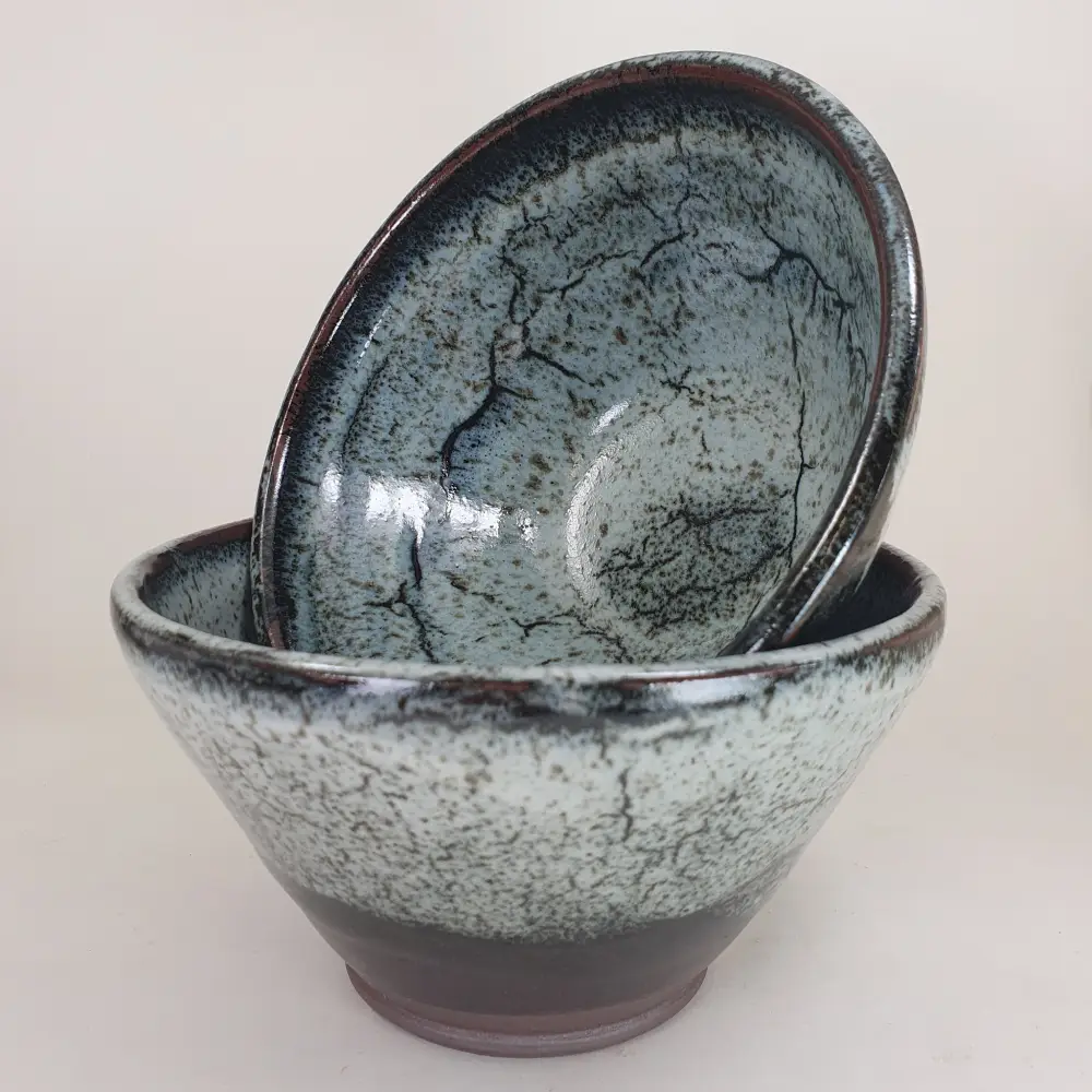 Ce duo de bols à « Poke bowl » en grès est entièrement tourné et émaillé dans mon atelier. Cette gamme de couleurs aux nuances turquoise apporte une note de fraicheur à table! Leur forme évasée et large est idéale pour déguster une jolie salade composée au saumon, décorée de graines de sésame noir, un riz relevé au vinaigre de riz, une soupe asiatique ou des « ramens ».